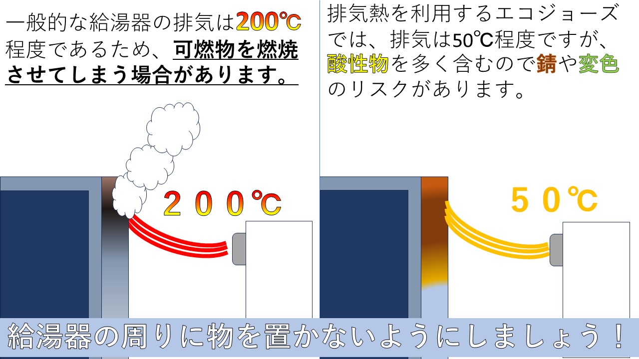 給湯器の周辺に可燃物を置いてしまうと排気による温度上昇で火災の原因になってしまったり、不燃物であったとしても、廃棄に含まれる酸性物によって、錆や変色などのトラブルの原因になり得ます。また、給湯器を囲ってしまったり、給排気口を塞いでしまうと不完全燃焼による故障の原因になり得るため、給湯器の周りにはできるだけ物を置かないようにしましょう。どうしても置かざるを得ない場合には排気カバーなどの取り付けを設備業者に依頼するようにしましょう。