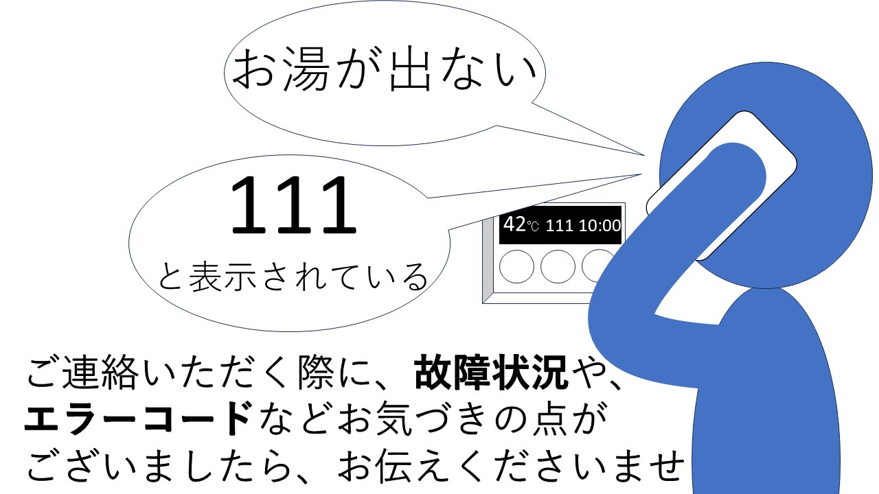 給湯器の故障には、お湯が出ない。温度が安定しない。異臭、異音がするなどの故障現象の他に、111や14、140などの2~3桁のエラーコードが表示されることがあります。故障現象やエラーコードを確認した際や、使用時に違和感があった際には、弊社、ミヨシテックのようなお近くのメンテ店や大阪ガスのグッドライフサービスにご連絡くださいませ。動くからと言って故障を放置したままの状態でご使用を続けてしまうと、新たな故障を誘発し、機器の寿命を縮めてしまったり、大きな事故に繋がってしまう場合があります。早期のご連絡をお願い致します。