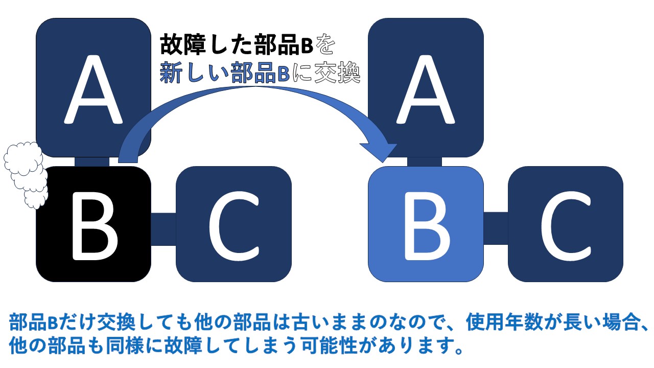 設置後10年間は修理により安全にご使用可能だとご説明いたしましたが、ご使用年数が10年未満であっても、ご使用頻度が高い場合には、修理ではなく買換えをご提案させていただく場合があります。なぜならば、ご使用頻度が高い場合には、正常な部品であっても、故障してしまった部品と同程度、経年劣化してしまっており、部品交換によって一時的に使えるようになったとしても他の部品の故障によって使えなくなってしまう可能性が高いためです。このことから、ご使用期間が10年に近い状態で修理をご検討の際には、買換えも視野に入れてご提案させていただく場合がございます。